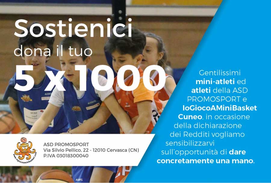 Destina anche tu il 5 per mille dell'IRPEF alla ASD PROMOSPORT - IoGiocoAMiniBasket: basta apporre la tua firma nell'apposito allegato del modello CUD, 730-I bis o UNICO, con l'indicazione del codice fiscale della ASD PROMOSPORT (03018300040), nella sezione dedicata alle Associazioni Sportive Dilettantistiche.