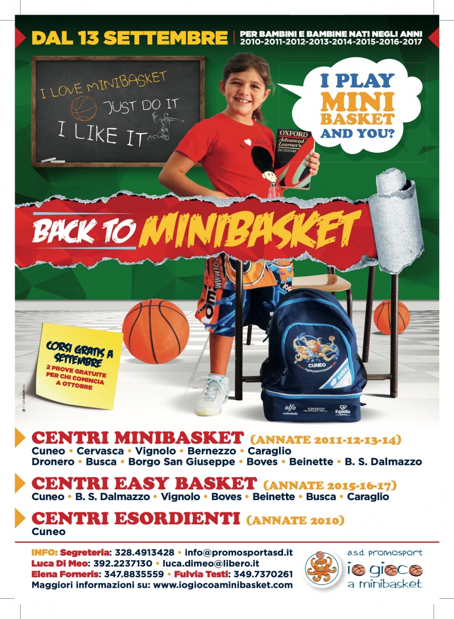 A Cuneo, a partire dal 13/09, nella Palestra dell'istituto Bonelli in Via M. d'Azeglio, si comincia dai più piccoli: i mini-atleti di 3-4 anni (Easy Basket) che giocheranno il giovedì dalle ore 17.00 alle ore 18.00.